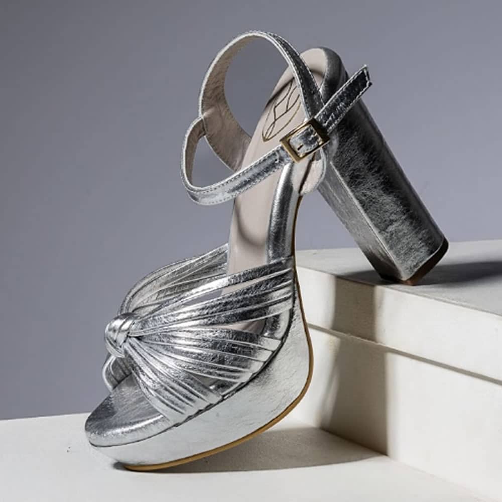 Brilla con cada paso usando nuestras deslumbrantes sandalias de tacón en tono plateado. Perfectas para elevar cualquier atuendo, estas sandalias destacan por su diseño con tiras plisadas que ofrecen un toque de elegancia y modernidad. El tacón alto proporciona una altura espectacular, mientras que la plataforma frontal asegura comodidad y estabilidad, permitiéndote disfrutar de tus momentos especiales sin preocuparte por el confort. Su hebilla ajustable garantiza un ajuste perfecto, haciendo que sean ideales para cenas, eventos o fiestas.